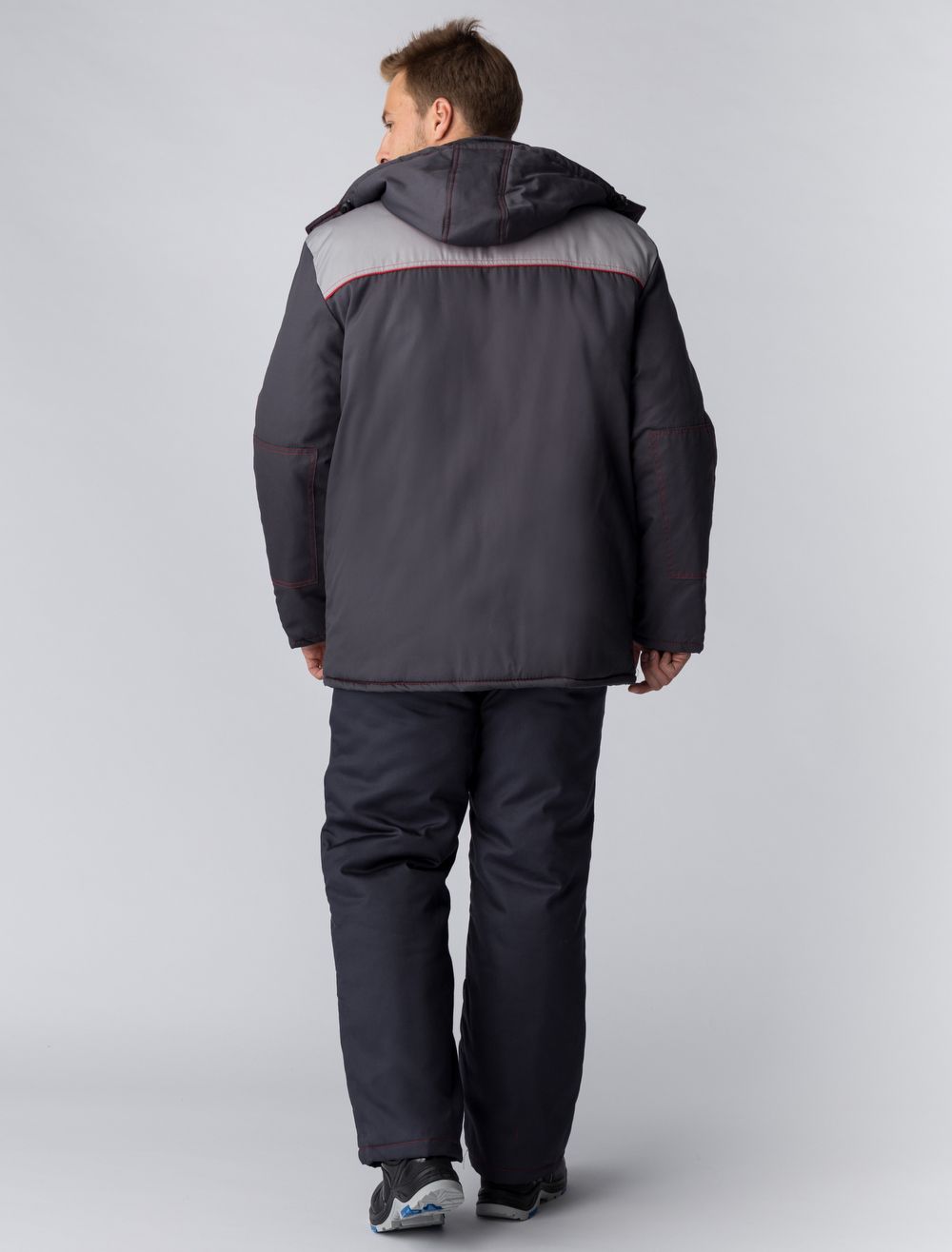 Мужской костюм: полукомбинезон и куртка. Чёрной отделкой дополнены отложной воротник, рукава, карманы на брюках, низ куртки и брючин. Красная отделка используется для кокетки (перед, спинка), клапанов. Светоотражающая полоса – на кокетке, полочках, рукавах и брючинах. Застёгивается на молнию по центру, дополнительно имеется контактная лента. Низ – на кнопке, эластичен по бокам. Вертикальные складки спинки. Имеются карманы: пара нагрудных (из них один с клапаном), пара боковых. Полукомбинезон: на бретелях и в талии – резинка, регулировка лямок карабинами. Карманы: на грудке – многофункциональный, боковые – накладные (с усилением), дополнительный под инструмент. Брючины оснащены усилительными накладками.