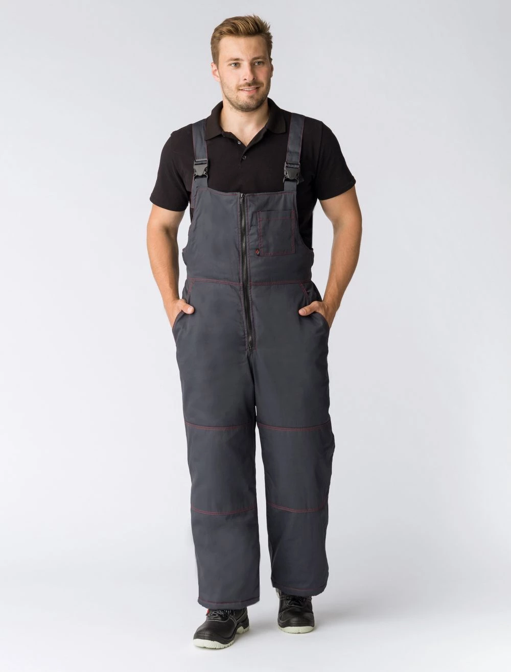 Мужской костюм: полукомбинезон и куртка. Чёрной отделкой дополнены отложной воротник, рукава, карманы на брюках, низ куртки и брючин. Красная отделка используется для кокетки (перед, спинка), клапанов. Светоотражающая полоса – на кокетке, полочках, рукавах и брючинах. Застёгивается на молнию по центру, дополнительно имеется контактная лента. Низ – на кнопке, эластичен по бокам. Вертикальные складки спинки. Имеются карманы: пара нагрудных (из них один с клапаном), пара боковых. Полукомбинезон: на бретелях и в талии – резинка, регулировка лямок карабинами. Карманы: на грудке – многофункциональный, боковые – накладные (с усилением), дополнительный под инструмент. Брючины оснащены усилительными накладками.